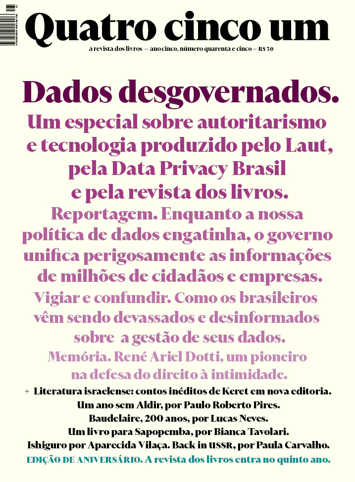 A 45a. edição, de maio de 2021, traz na capa um especial sobre autoritarismo e tecnologia produzido pelo Laut, pela Data Privacy Brasil e pela revista dos livros: os largos passos do governo federal para tentar controlar suas informações, as trapalhadas envolvendo a vigilância no Brasil e um perfil de René Ariel Dotti, pioneiro na defesa do direito à intimidade..